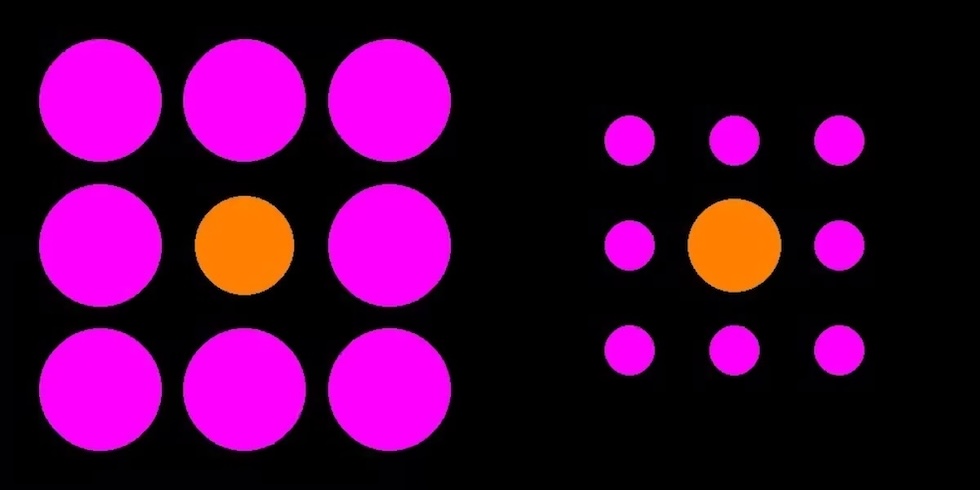 Un altro studio, pubblicato a marzo, ha concluso che l’interpretazione di un’altra famosa illusione ottica può essere invece influenzata da fattori individuali. Ha preso in considerazione l’illusione di Ebbinghaus: è quella in cui due cerchi pieni della stessa grandezza sembrano uno più piccolo dell’altro a seconda che abbiano intorno cerchi più grandi o più piccoli.