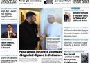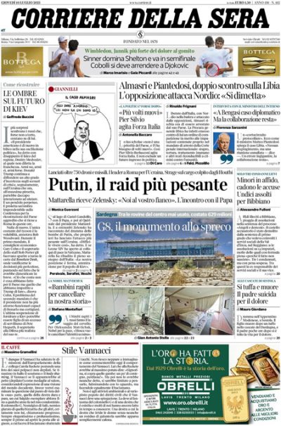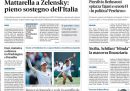 Sono diverse le notizie in apertura sui giornali di oggi: alcuni si occupano dell’arrivo a Roma, dove oggi inizia la conferenza internazionale sulla ricostruzione in Ucraina, del presidente ucraino Zelensky, che ha incontrato il presidente della Repubblica Mattarella e papa Leone XIV, altri titolano sulle richieste di dimissioni da parte delle opposizioni per il ministro della Giustizia Nordio per la vicenda dell’arresto e della successiva liberazione del capo della polizia giudiziaria libica Almasri. Qualche giornale apre poi sul discorso di Pier Silvio Berlusconi durante la presentazione dei palinsesti di Mediaset, nel quale ha affrontato anche temi politici, altri ancora si occupano dello studio sull’ondata di calore che ha interessato diversi paesi europei secondo il quale il cambiamento climatico ha aumentato il numero di morti. I giornali sportivi si dividono fra le notizie di calciomercato e la vittoria a Wimbledon di Sinner, che raggiunge le semifinali del singolare maschile in cui incontrerà Djokovic.
