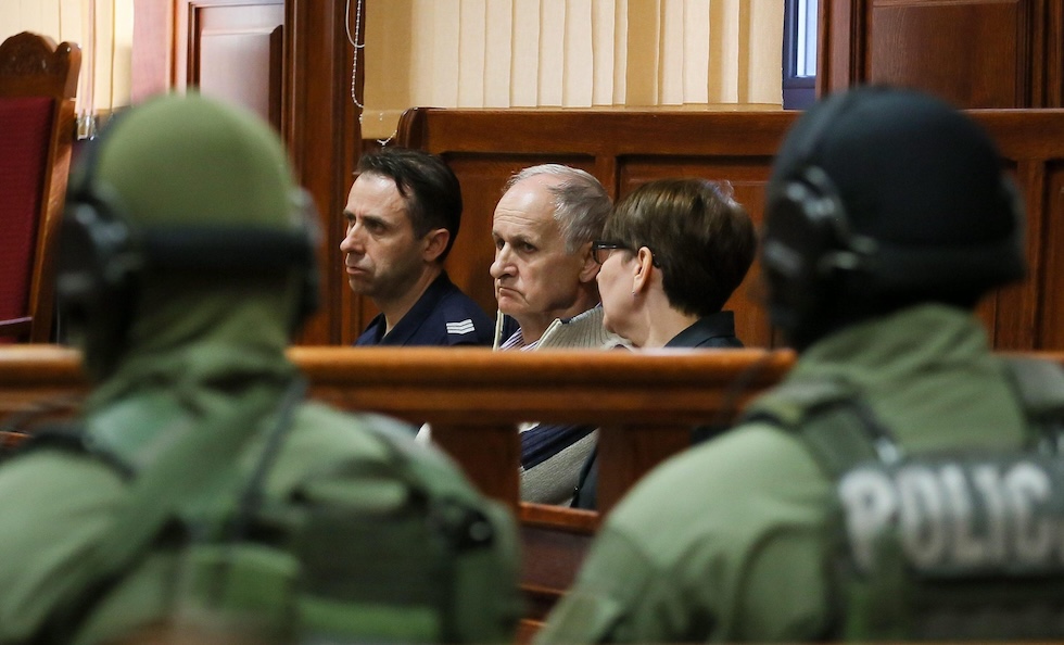 Radislav Krstić, al centro, durante un’udienza a Varsavia, in Polonia, nel 2014, dove fu detenuto a partire da quell’anno fino al 2025; oggi sta scontando la sua condanna in Estonia (ANSA/EPA/PAWEL SUPERNAK)