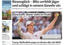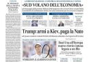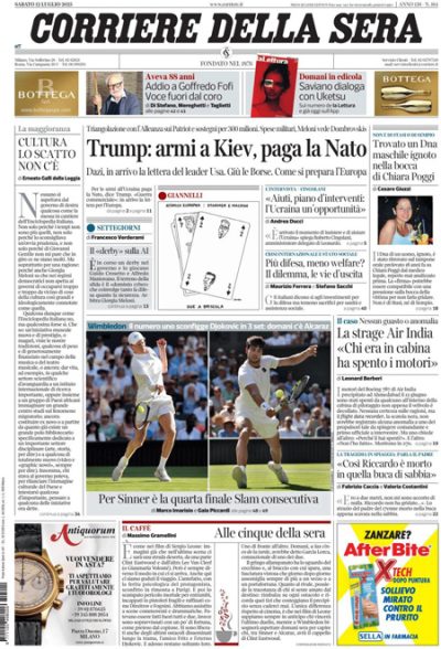 Sulla maggior parte dei giornali l’apertura è dedicata all’annuncio del presidente degli Stati Uniti Trump della ripresa delle forniture militari all’Ucraina per il tramite della NATO e di un’ulteriore dichiarazione prevista per lunedì indirizzata alla Russia, probabilmente sulle sanzioni economiche. Qualche giornale si occupa della trattativa fra Unione Europea e Stati Uniti sui dazi, il Manifesto apre sulla cerimonia con cui il partito curdo PKK ha iniziato il disarmo distruggendo pubblicamente le proprie armi, il Giornale e Libero titolano su una tassa sulle sigarette a cui starebbe lavorando la Commissione Europea, il Fatto segue un’indagine su presunte tangenti in Sicilia, e i giornali sportivi commentano la qualificazione di Jannik Sinner alla finale del torneo di singolare maschile di Wimbledon, nella quale giocherà domenica contro Carlos Alcaraz.