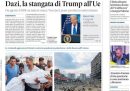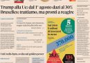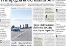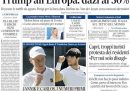 La stragrande maggioranza delle prime pagine di oggi è dedicata ai dazi del 30 per cento minacciati dal presidente degli Stati Uniti Donald Trump all’Europa. È la notizia principale anche sui quotidiani di destra più vicini alla maggioranza che sostiene il governo, come Libero e Il Giornale, che spesso invece scelgono di fare il titolo su argomenti meno trattati rispetto agli altri giornali (nell’occhiello Libero scrive «Europa suicida»). I quotidiani sportivi hanno molto in evidenza la finale di Wimbledon tra Jannik Sinner e Carlos Alcaraz, che si giocherà oggi pomeriggio alle 17.
