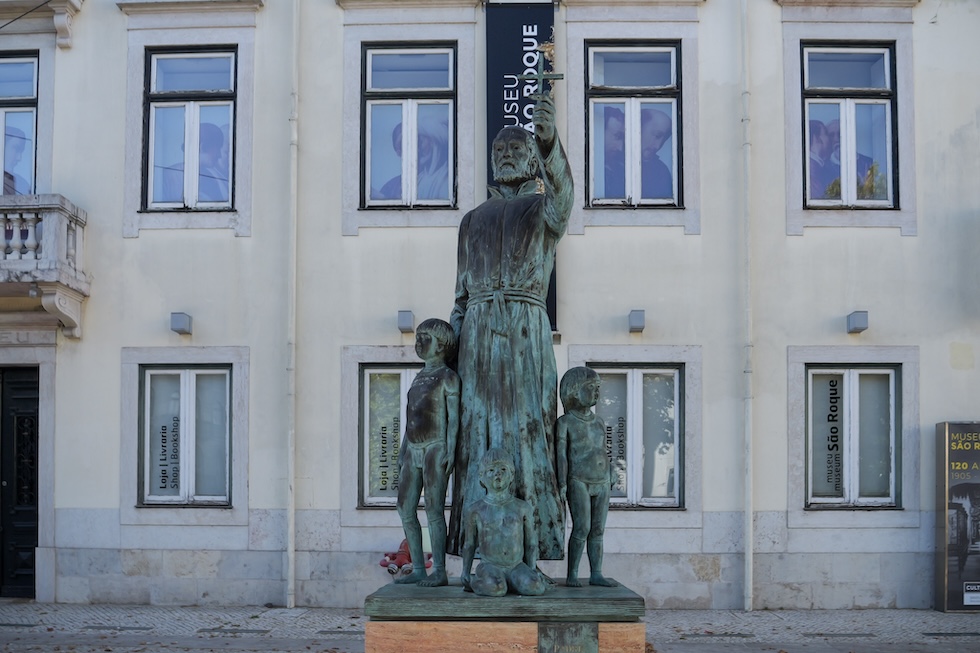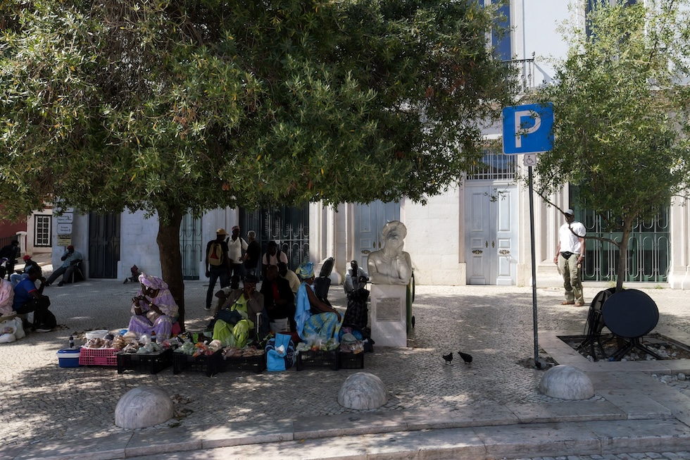 La sua statua è piuttosto difficile da identificare: guardando la chiesa si trova in un angolo distante sulla sinistra, in una stradina laterale che costeggia la piazza e sale, come capita spesso a Lisbona. Ancora oggi è circondata ogni giorno da gruppetti di venditori ambulanti. Usano la statua come punto di ritrovo e approfittano dell’ombra generata dall’albero che si trova proprio accanto e che, senza farlo apposta, la avvolge in un cono d’ombra, cosa che la rende ancora meno visibile.