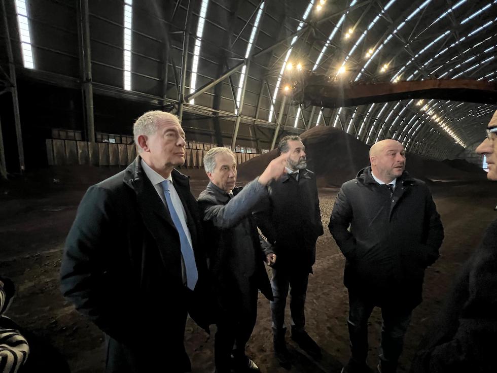 Il ministro delle Imprese Adolfo Urso all’ex ILVA per incontrare i lavoratori al cambio turno, insieme al commissario straordinario Giancarlo Quaranta, il 27 febbraio 2024 (ANSA/ UFFICIO STAMPA DEL MINISTRO)
