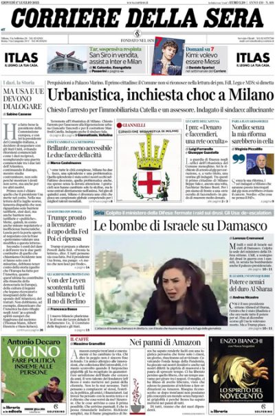Sulla maggior parte dei giornali di oggi l’apertura è dedicata all’indagine della procura di Milano sull’urbanistica in città, per la quale ieri sono stati chiesti gli arresti di sei persone fra cui l’assessore alla Rigenerazione urbana del comune di Milano, e nella quale è indagato anche il sindaco Sala per falso. Qualche giornale si occupa invece del bombardamento israeliano sulla capitale della Siria Damasco, altri titolano sul bilancio pluriennale dell’Unione Europea presentato ieri dalla Commissione Europea. I giornali sportivi, oltre alle notizie consuete in questo periodo sul calciomercato, celebrano la qualificazione dell’Italia alle semifinali degli Europei femminili di calcio in corso in Svizzera.