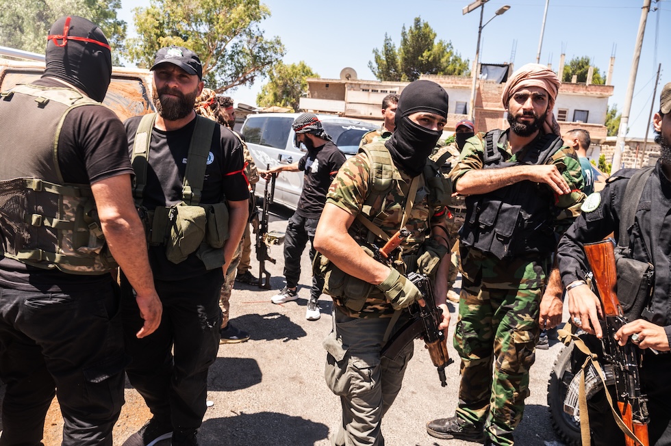 Milizie del governo siriano, che includono combattenti jihadisti, a Izraa, nella regione di Suwayda, 16 luglio (Gabriele Micalizzi, CESURA, per il Post)