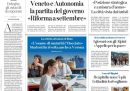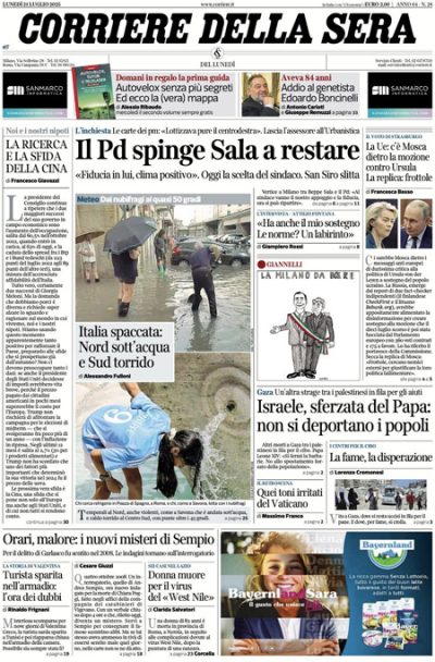 Le notizie principali su cui aprono i giornali di oggi sono due: l’indagine sull’urbanistica a Milano nella quale è indagato anche il sindaco Sala, che oggi interverrà in Consiglio comunale dopo aver ricevuto il sostegno del Partito Democratico, e la situazione nella Striscia di Gaza, dove ieri c’è stata l’ennesima strage di palestinesi da parte dell’esercito israeliano durante la distribuzione degli aiuti, mentre papa Leone XIV ha chiesto durante l’Angelus che termini la “barbarie”.
