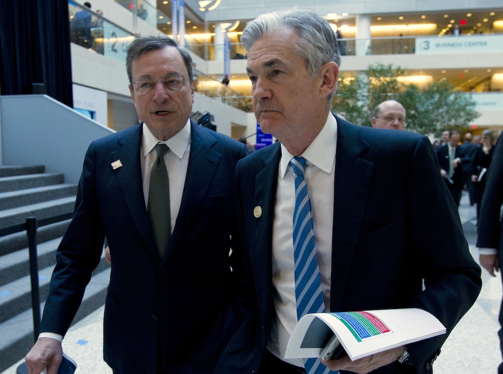 Mario Draghi con Jerome Powell, nel 2018 (AP Photo/Jose Luis Magana)