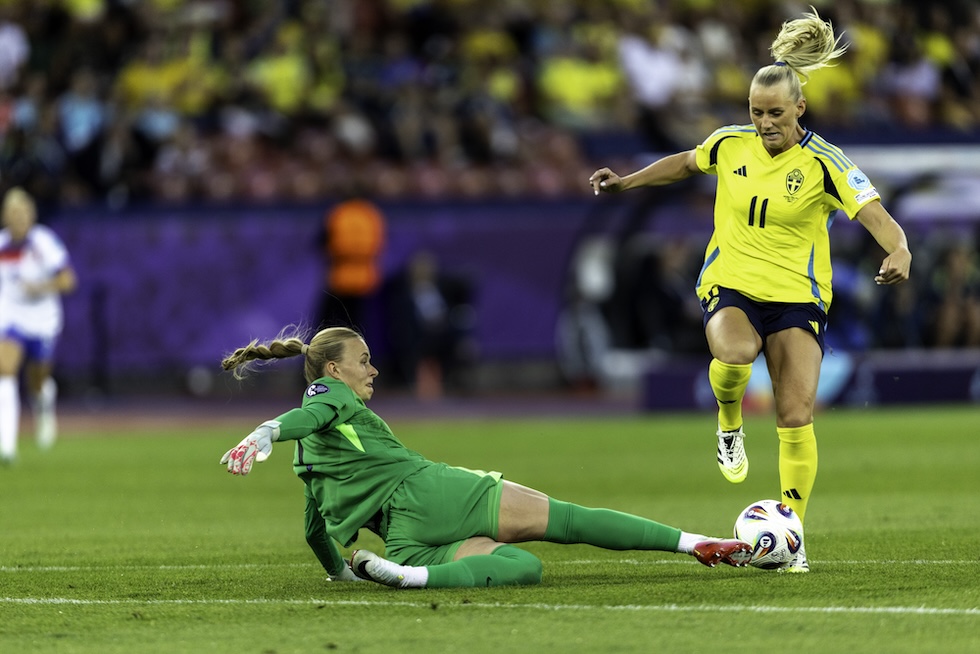Un’uscita di Hannah Hampton contro la Svezia (Pascal Kesselmark/Eurasia Sport Images/Getty Images)