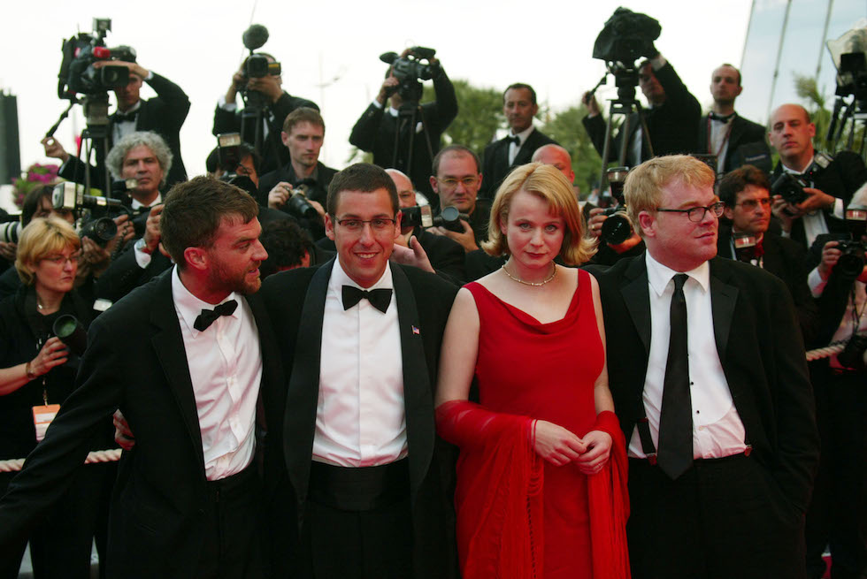 Paul Thomas Anderson, Adam Sandler, Emily Watson e Philip Seymour Hoffman al festival di Cannes del 2002 per “Ubriaco d’amore”. (Evan Agostini/ImageDirect)
