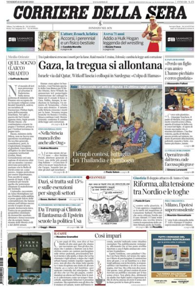 Sulla maggior parte dei giornali di oggi l’apertura riguarda la situazione nella Striscia di Gaza, con le condizioni drammatiche in cui vive la popolazione palestinese, i negoziati per arrivare a un cessate il fuoco da cui si sono ritirati ieri Stati Uniti e Israele per le richieste di Hamas giudicate eccessive, l’annuncio del presidente francese Macron che la Francia riconoscerà lo stato di Palestina, e le parole di un ministro israeliano sull’annessione di Gaza da parte di Israele. La Stampa apre invece sui costi dei centri per persone migranti costruiti dall’Italia in Albania, il Giornale, il Fatto, la Verità e Libero si occupano delle inchieste giudiziarie che riguardano il sindaco di Milano Sala e il parlamentare europeo del Partito Democratico Ricci, il Resto del Carlino della trattativa sui dazi fra Stati Uniti e Unione Europea, mentre il Sole 24 Ore apre sulla previsione dell’Ocse sugli effetti sul mondo del lavoro del calo demografico in Italia nei prossimi anni.