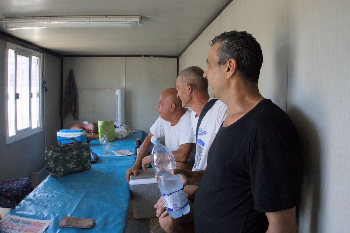Operai in una delle cosiddette “baracche”, come le chiamano nel settore edile: prefabbricati temporanei in cui i lavoratori possono mangiare e riposare, al riparo dal caldo (Simone Fant/il Post)