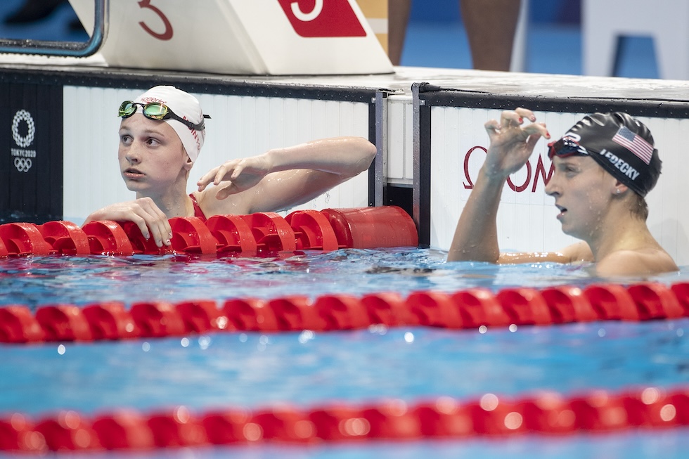 Summer McIntosh e Katie Ledecky alle Olimpiadi di Tokyo, quando la canadese aveva solo 14 anni (Tim Clayton/Corbis via Getty Images)