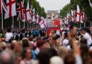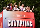 Nel pomeriggio del 29 luglio decine di migliaia di persone (65mila, secondo la squadra) hanno partecipato a Londra alla parata organizzata per festeggiare la vittoria dell’Inghilterra agli Europei femminili di calcio. Come si fa in questi casi le giocatrici e l’allenatrice (l’olandese Sarina Wiegman, alla sua terza vittoria consecutiva agli Europei) hanno sfilato su un bus scoperto lungo l’ampio viale noto come The Mall, nel centro della città, per poi arrivare su un palco vicino al Victoria Memorial, di fronte a Buckingham Palace, la residenza della famiglia reale.