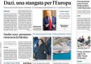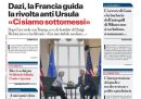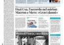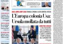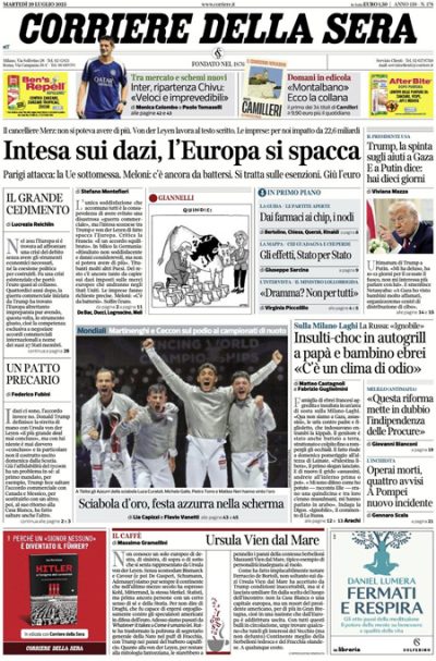 Le aperture dei giornali di oggi sono tutte dedicate alle reazioni all’accordo raggiunto dal presidente degli Stati Uniti Trump e dalla presidente della Commissione europea von der Leyen sui dazi nell’incontro di domenica in Scozia: le critiche più dure vengono dal governo francese, anche il cancelliere tedesco Merz ha espresso perplessità, mentre la presidente del Consiglio Meloni difende l’accordo. Avvenire apre invece sulla situazione nella Striscia di Gaza e sul rapporto di due organizzazioni non governative israeliane molto critico sulle operazioni dell’esercito israeliano.