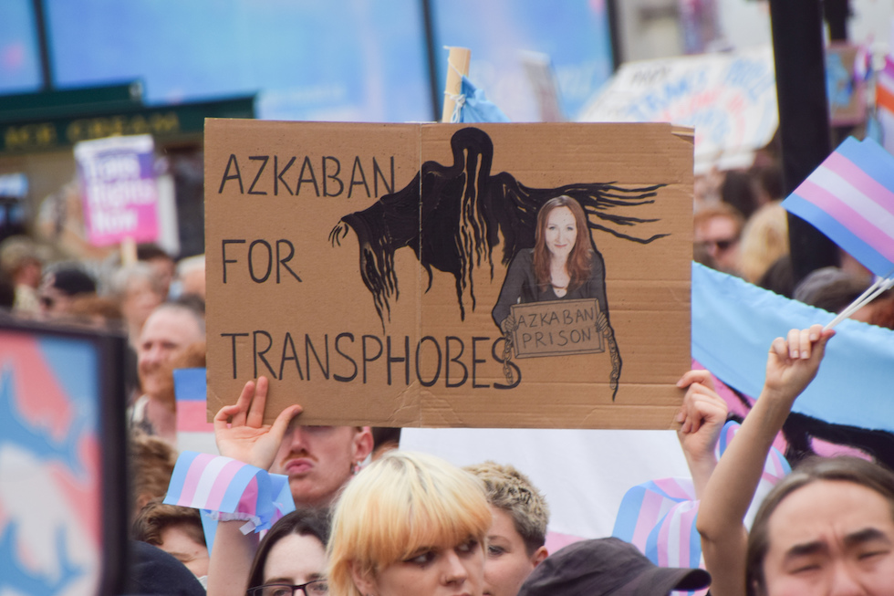 Un cartello contro Rowling alla parata del Pride di Londra nel 2025 (Vuk Valcic/ZUMA Press Wire)
