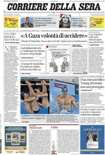 Ci sono notizie diverse in apertura sui giornali di oggi, ma la maggior parte titola sulle critiche espresse dal presidente della Repubblica Mattarella durante l’incontro al Quirinale con i giornalisti parlamentari a Israele per la gestione delle operazioni militari nella Striscia di Gaza e alla Russia per l’invasione dell’Ucraina; alcuni giornali associano a questa notizia l’inserimento del nome di Mattarella in una lista pubblicata dal ministero degli Esteri russo di politici considerati ostili. Qualche giornale apre invece sugli effetti sull’economia italiana dell’accordo sui dazi fra Unione Europea e Stati Uniti, Libero intervista il ministro degli Esteri Tajani sul futuro di Forza Italia, e il Tempo si occupa del disegno di legge costituzionale approvato dal governo per assegnare poteri speciali alla città di Roma.