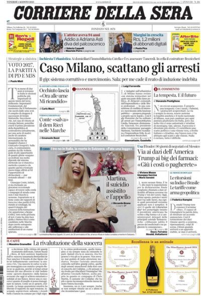 Sono diverse le notizie in apertura sui giornali di oggi, ma molti si occupano degli arresti decisi dal giudice per le indagini preliminari per sei persone indagate nell’inchiesta sull’urbanistica a Milano; sempre su politica e inchieste giudiziarie, qualche giornale associa a questa notizia l’approvazione del Movimento 5 Stelle della candidatura alla presidenza della regione Marche di Matteo Ricci dopo il suo interrogatorio, e le dichiarazioni del presidente della regione Calabria Occhiuto, indagato per corruzione, che ha detto di volersi dimettere e ricandidare. Altri quotidiani seguono la guerra a Gaza e le reazioni internazionali, con l’intenzione della Germania di riconoscere lo stato della Palestina, mentre Repubblica apre con un’intervista allo scrittore israeliano David Grossman sull’uso della definizione di “genocidio” per l’azione militare israeliana. Qualche giornale titola poi sui dazi degli Stati Uniti sui prodotti dell’Unione Europea che dovrebbero entrare in vigore da oggi, nonostante le incertezze per la mancanza di un accordo scritto.