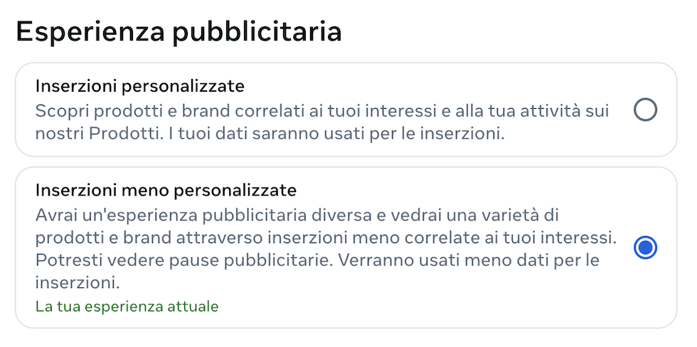Chi ha scelto di non pagare (la stragrande maggioranza) e continuare a usare Instagram gratuitamente con la pubblicità è stato poi invitato a scegliere, in un avviso successivo, tra due tipi di pubblicità: “inserzioni personalizzate” o “inserzioni meno personalizzate”. La seconda opzione dà la possibilità di scegliere annunci meno mirati e meno calibrati sui propri interessi, cioè quelli per i quali Meta raccoglie e usa meno dati, accogliendo le richieste dell’Unione Europea.