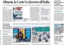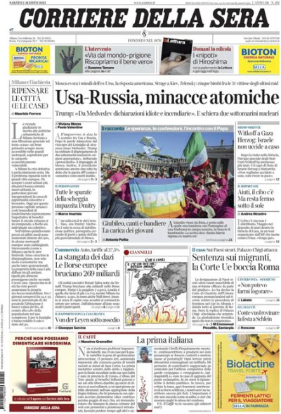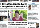 Ci sono notizie diverse in apertura sui giornali di oggi, ma la maggior parte si occupa della sentenza della Corte di Giustizia dell’Unione Europea che ha stabilito che per definire sicuro un paese di origine delle persone migranti deve essere tale per tutti gli abitanti e su tutto il suo territorio, e che i giudici devono poter valutare caso per caso la definizione di paese sicuro fatta dai governi. Qualche giornale titola invece sui nuovi dazi annunciati dal presidente degli Stati Uniti Trump per molti paesi e sulla giornata difficile delle borse mondiali in conseguenza dell’annuncio, il Corriere della Sera apre sullo scambio di accuse fra Trump e l’ex presidente russo Medvedev e sulla decisione di Trump di schierare due sottomarini nucleari “nelle regioni appropriate”, probabilmente in aree vicine alla Russia, mentre il Fatto Quotidiano si occupa delle inchieste giudiziarie sull’urbanistica a Milano.