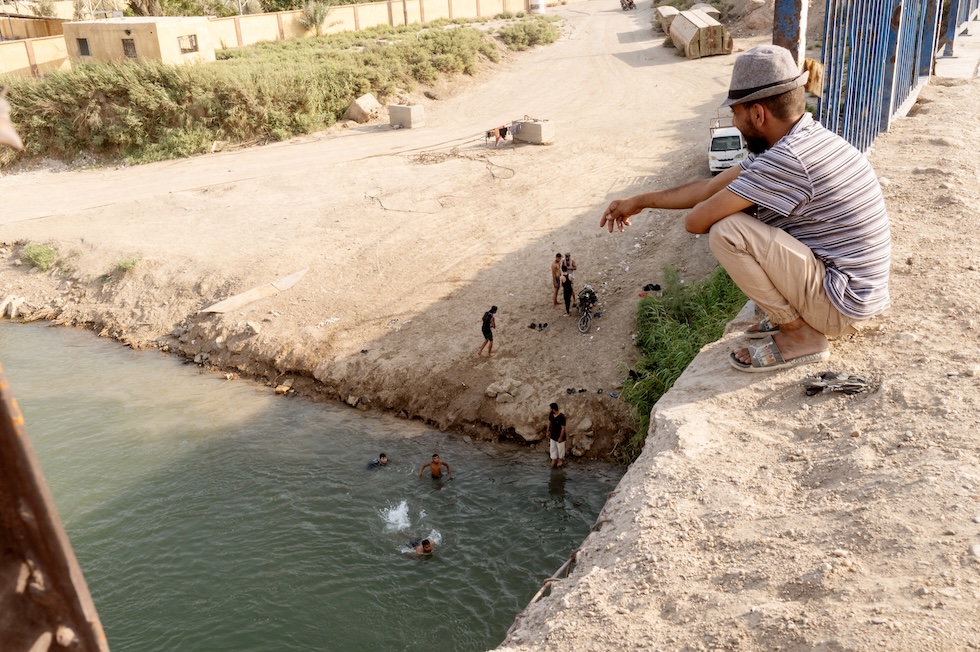 Ragazzi fanno il bagno nel fiume Eufrate, sotto il ponte distrutto che univa i due lati del fiume oggi in mano a SDF e ai curdi, Deir Ezzor, 14 luglio 2025 (Gabriele Micalizzi, CESURA, per il Post)