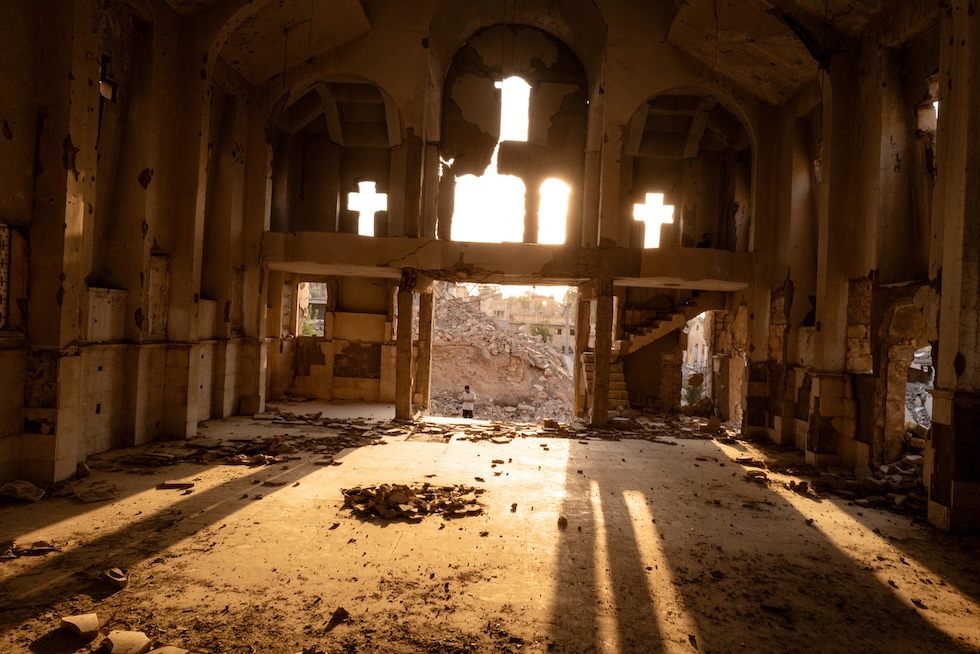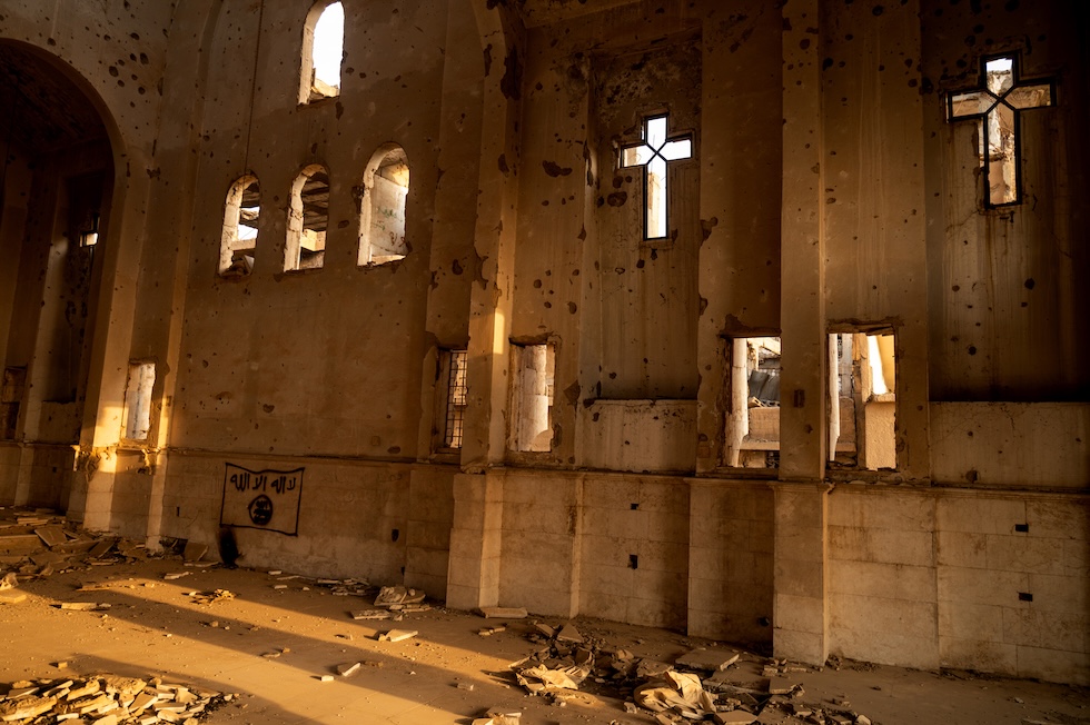 Dentro al quartiere distrutto di al Rashidiya c’è la chiesa dei martiri armeni, costruita in modo che al mattino e al pomeriggio tardi le tre navate siano inondate dalla luce del sole. È stata saccheggiata dallo Stato islamico, svuotata di tutto e poi danneggiata con cariche esplosive. Su un lato della navata di destra c’è ancora la bandiera del gruppo terrorista, dipinta con vernice nera.