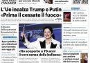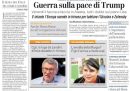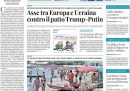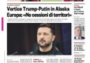 Molti giornali aprono con l’annuncio dell’incontro tra Donald Trump e Vladimir Putin a Ferragosto, e soprattutto con la risposta di Volodymyr Zelensky, che si è detto contrario a qualsiasi accordo di pace che preveda una cessione territoriale. Si parla anche del comunicato congiunto di Australia, Germania, Italia, Nuova Zelanda e Regno Unito per «rifiutare con forza» l’intenzione di Israele di occupare la città di Gaza, poi dell’incendio sulle pendici del Vesuvio e delle polemiche sul ponte sullo Stretto di Messina.