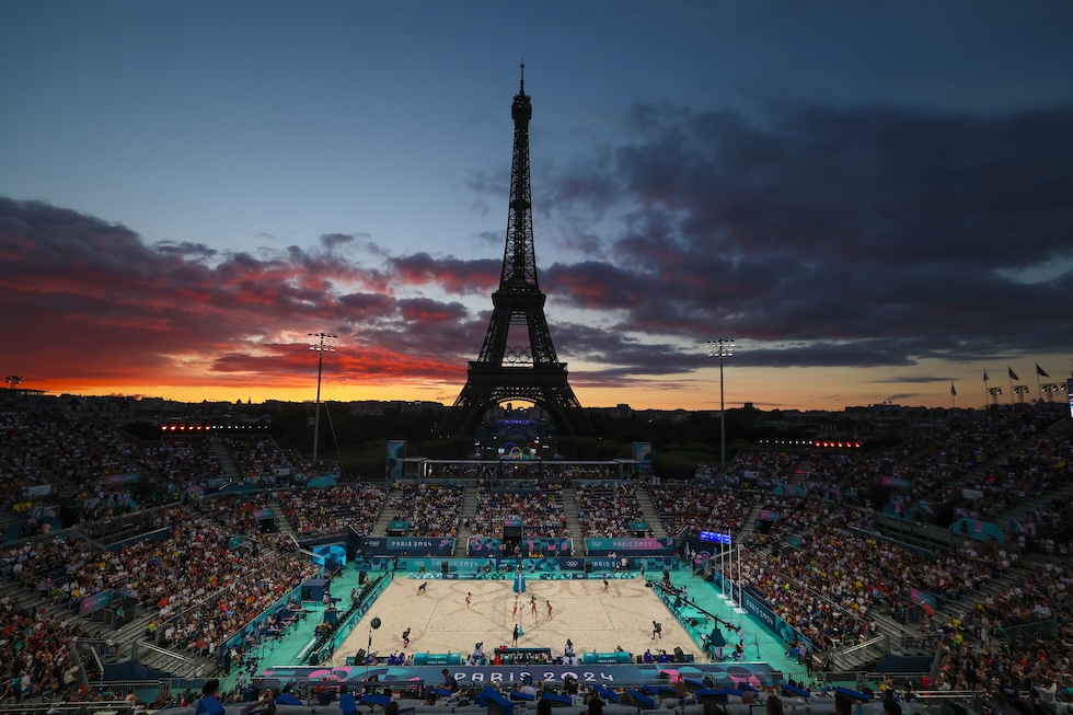 Una partita del torneo olimpico di beach volley, il 9 agosto 2024 a Parigi (Matthew Stockman/Getty Images)