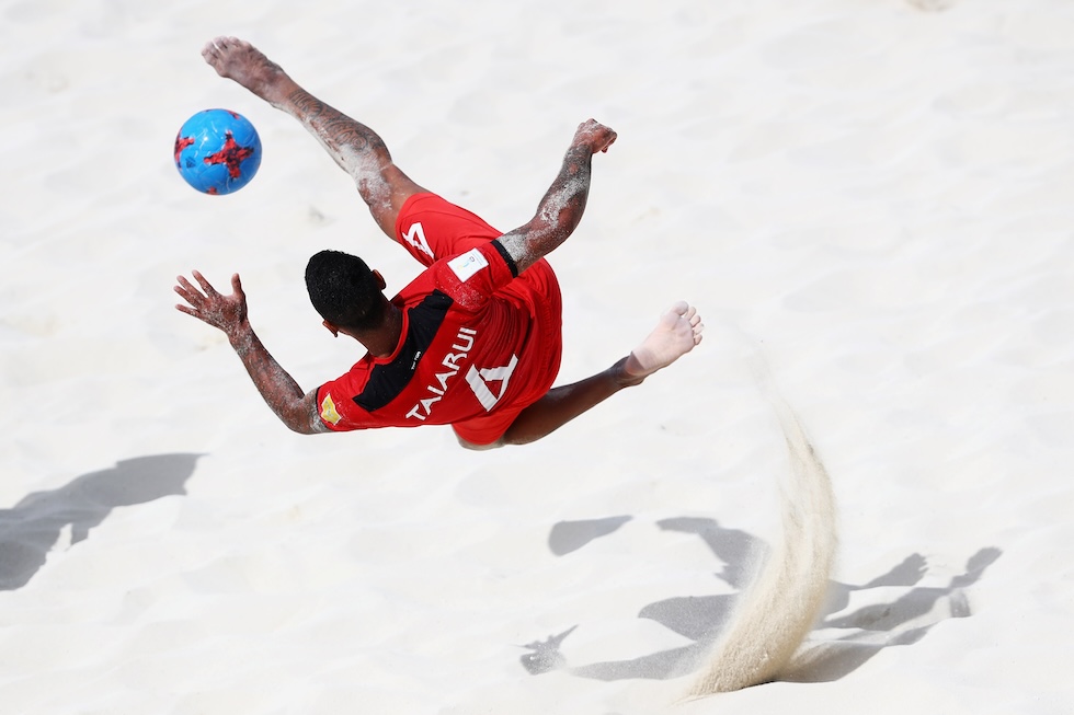 Una rovesciata, il gesto per eccellenza del beach soccer, ai Mondiali del 2017 a Nassau, Bahamas (Dean Mouhtaropoulos – FIFA/FIFA via Getty Images)