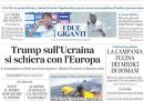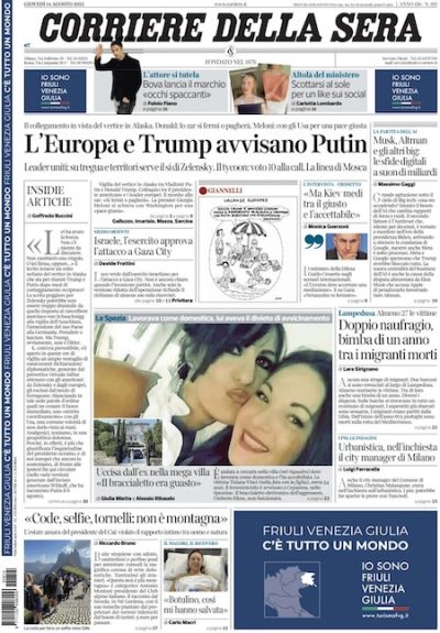 Oggi molti giornali dedicano il titolo di apertura alla telefonata tra il presidente degli Stati Uniti Donald Trump e alcuni leader europei in vista del suo incontro con Vladimir Putin per discutere della guerra in Ucraina, che si terrà in Alaska venerdì. Trova spazio anche il naufragio avvenuto a Lampedusa in cui sono morte almeno 27 persone partite dalla Libia. Tutti i giornali di destra puntano sul caso dei quattro ragazzini che a Milano hanno investito e ucciso una donna con un’auto rubata. Il Sole 24 Ore racconta dei record raggiunti dalla Borsa di Milano, mentre sui quotidiani sportivi si parla ovviamente molto di calciomercato.