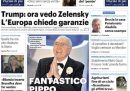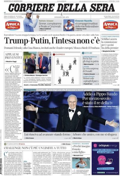 La maggior parte dei giornali di oggi dedica l’apertura agli sviluppi dell’incontro in Alaska tra il presidente degli Stati Uniti Donald Trump e il suo omologo russo Vladimir Putin e alla visita del presidente ucraino Volodymyr Zelensky alla Casa Bianca, prevista per lunedì. Grande spazio è però dedicato a Pippo Baudo, uno dei più noti e importanti conduttori televisivi italiani, morto sabato a 89 anni. Si parla anche dello scioglimento del NITAG (Gruppo Tecnico Consultivo Nazionale sulle Vaccinazioni), un organismo indipendente composto da esperti che ha il compito di dare pareri scientifici sui vaccini e consigli sulle politiche vaccinali, fatto decadere sabato con un decreto del ministro della Salute Orazio Schillaci dopo giorni di polemiche. Altri danno risalto all’inchiesta sull’edilizia a Milano, altri ancora a un caso di cronaca avvenuto a Ischia, in Campania, dove un uomo ha ucciso la suocera e il compagno dell’ex moglie per poi togliersi la vita.