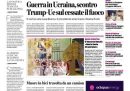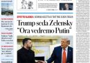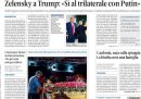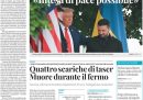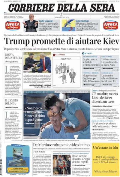 Anche oggi come nei giorni scorsi quasi tutti i quotidiani dedicano la notizia in apertura all’incontro che c’è stato lunedì sera a Washington fra Volodymyr Zelensky, Donald Trump e diversi altri leader europei (fra cui Giorgia Meloni). Molti scrivono poi in prima pagina delle due persone morte nel giro di 48 ore dopo essere state colpite dai taser delle forze dell’ordine, in circostanze diverse. Altri si occupano ancora della morte di Pippo Baudo: ieri c’è stata la camera ardente a Roma. Infine, anche fra i quotidiani non sportivi alcuni scrivono del ritiro di Jannik Sinner dalla finale dell’importante torneo di tennis di Cincinnati.