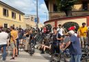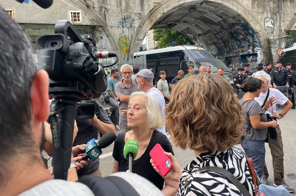 Marina Boer, presidente dell’associazione Mamme antifasciste del Leoncavallo, mentre parla con i giornalisti, Milano, 21 agosto 2025 (Il Post)