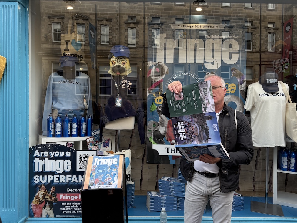 Un uomo sfoglia il programma del Fringe davanti al negozio dedicato al festival: 389 pagine, 7 agosto 2025 (il Post)