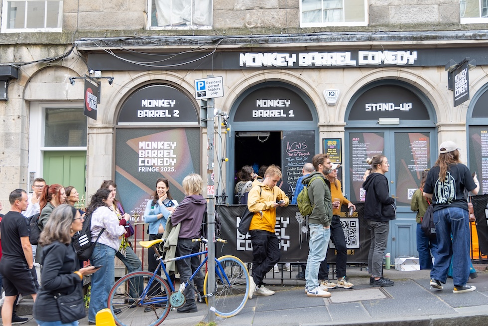 Persone in coda per entrare al Monkey Barrel, uno dei locali dove ci sono gli spettacoli del Fringe, 8 agosto 2025 (Athanasios Gioumpasis/Getty Images)