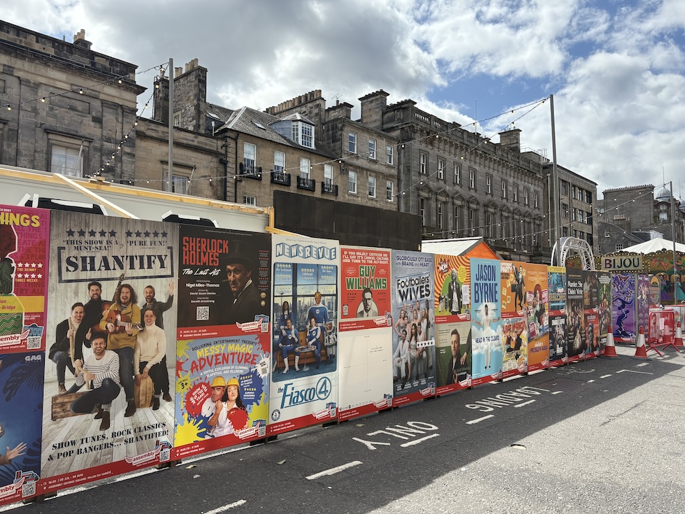 Manifesti di alcuni degli spettacoli del Fringe Festival in George Street, 6 agosto 2025 (il Post)