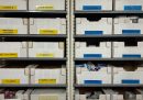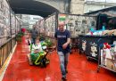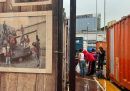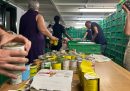 Alcune persone scaricano pacchi alimentari davanti alla sede di Music for Peace a Genova (Angelo Mastrandrea/il Post)