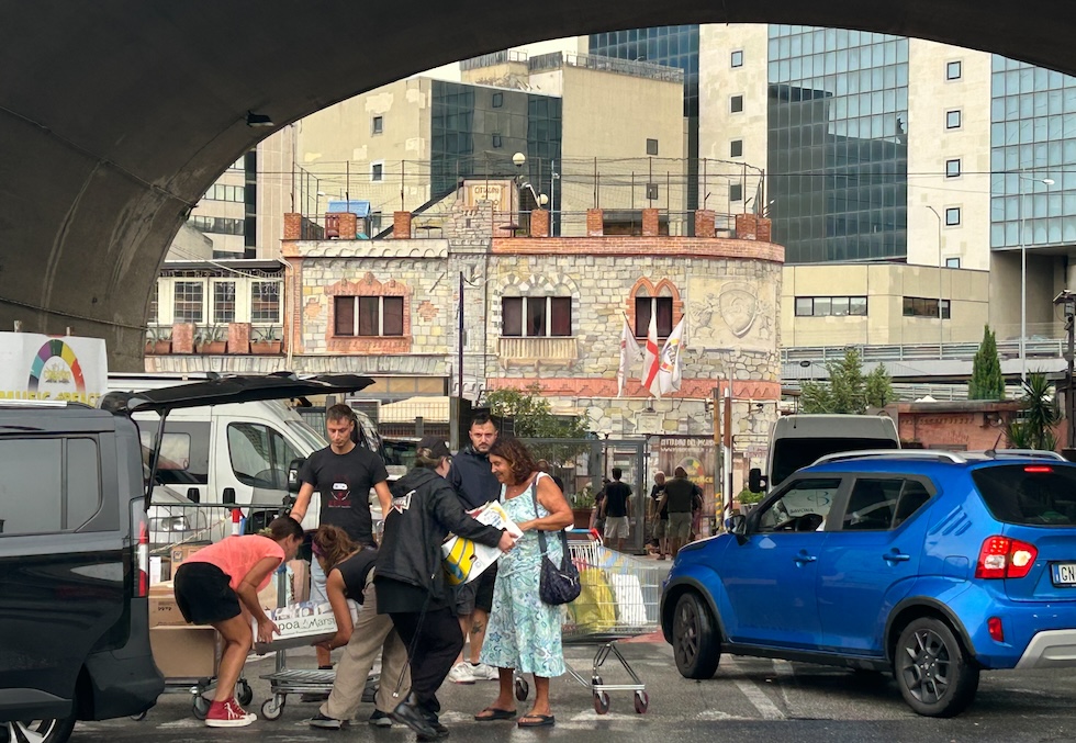 A pochi metri dalla Lanterna, il faro simbolo di Genova, dalla mattina presto di venerdì c’è un via vai continuo di persone che portano pacchi di pasta, farina, scatolette di tonno e marmellate. Vengono consegnate alla Global Sumud Flotilla, la più grande iniziativa indipendente per cercare di portare aiuti alla popolazione civile della Striscia di Gaza con decine di barche a vela. Molte persone arrivano con carrelli della spesa presi dai vicini supermercati, altre invece portano i sacchetti a mano, con i motorini o con le auto. Attendono il loro turno, si incanalano in un percorso pedonale transennato, li consegnano ai volontari e vanno via. Qualcuno offre un aiuto per smistare la merce e impacchettarla, ma viene gentilmente respinto perché «siamo già pieni e non sapremmo cosa farvi fare».