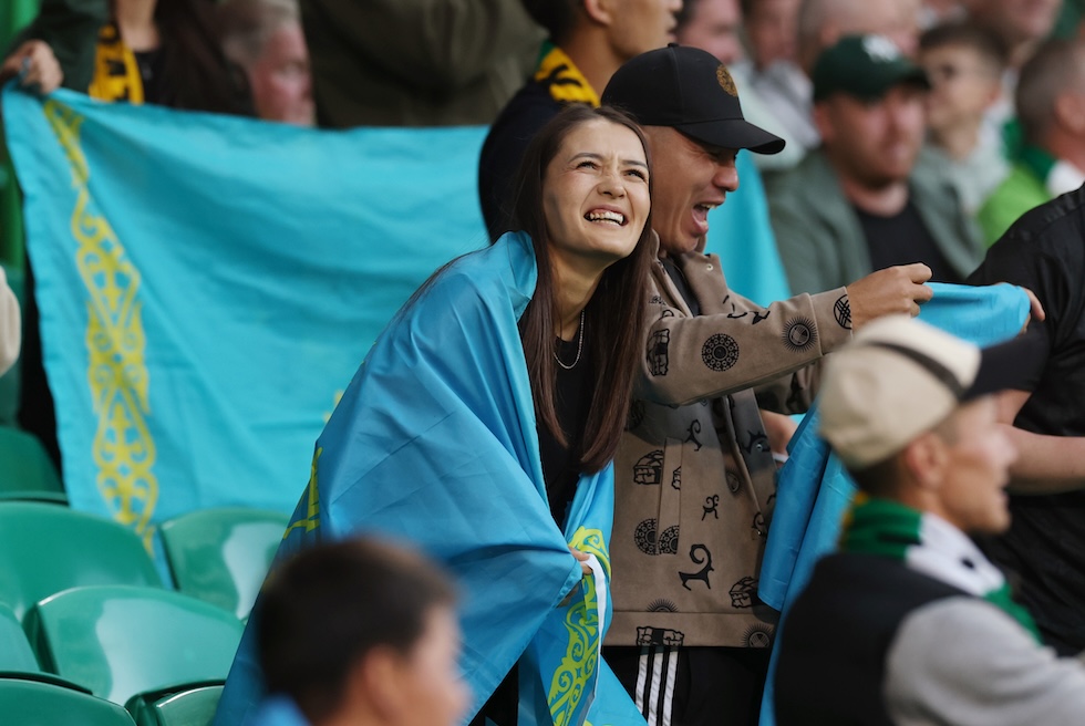 Tifosi del Kairat e bandiere kazake, il 20 agosto 2025 a Glasgow, in Scozia ( Ian MacNicol/Getty Images)