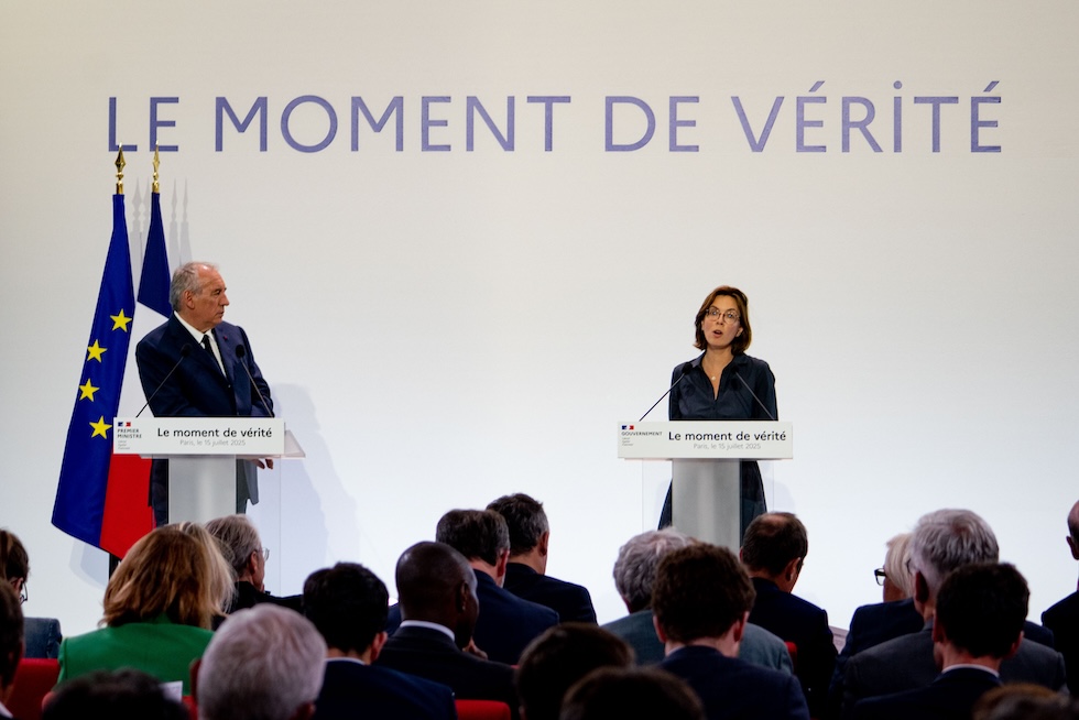 Il primo ministro francese François Bayrou e la ministra del Bilancio Amélie de Montchalin presentano le linee guida del bilancio 2026 durante una conferenza stampa a Parigi, a luglio del 2025 (ANSA/Stefano Lorusso/ZUMA Press Wire)