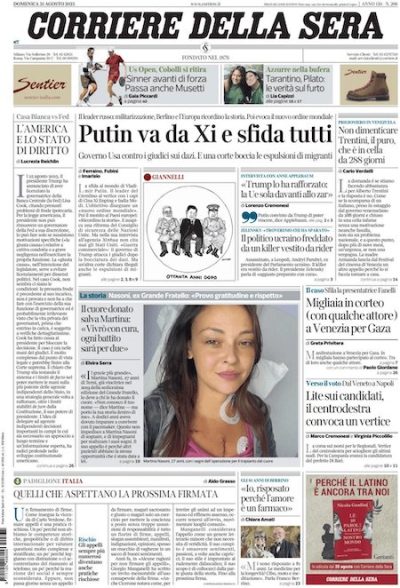 La mancanza di grosse notizie rende le prime pagine di oggi piuttosto diverse tra loro, anche se c’è una lieve maggioranza di quotidiani nazionali che sceglie di aprire con i dazi di Trump, che sono stati giudicati illegali da un tribunale federale statunitense. Altri mettono in prima pagina ancora l’offensiva militare a Gaza, oppure l’incontro previsto per domenica tra il presidente cinese Xi Jinping e quello russo Vladimir Putin, a Shanghai. Gli sportivi si occupano soprattutto di Serie A (la Roma e il Napoli hanno vinto entrambe 1-0) ma anche di Jannik Sinner, che sabato sera ha battuto Denis Shapovalov in quattro set e si è qualificato per gli ottavi di finale agli US Open di tennis.