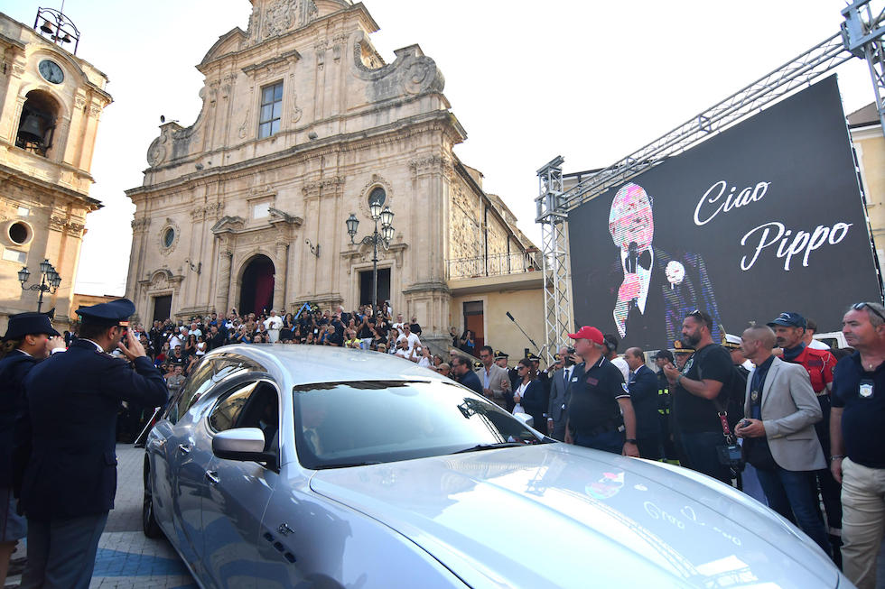 Il feretro di Pippo Baudo lascia il santuario di Santa Maria della Stella di Militello, 20 agosto 2025 (ANSA/ORIETTA SCARDINO)