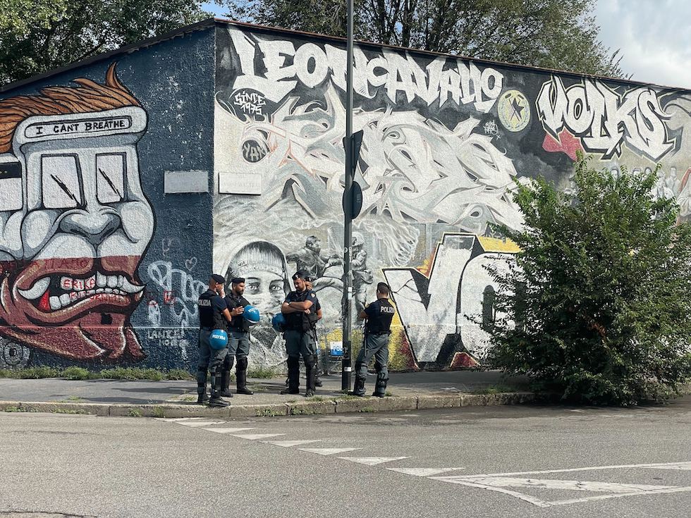 Agenti di polizia davanti al Leoncavallo durante le operazioni in vista dello sgombero, 21 agosto 2025 (il Post)