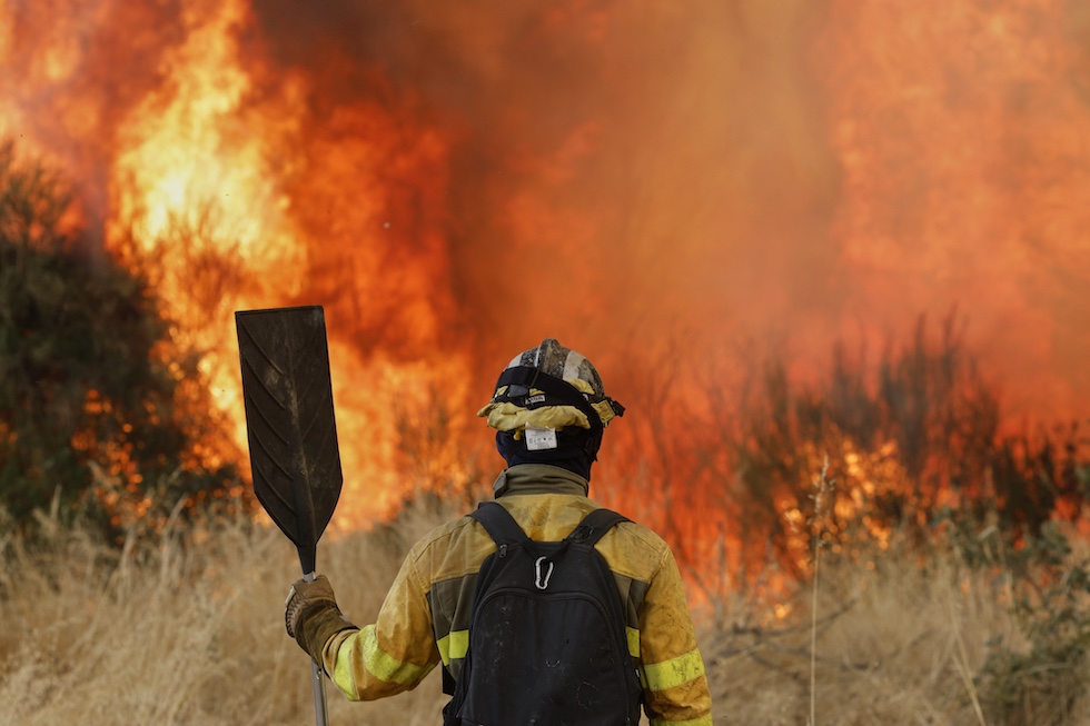 Un vigile del fuoco a Veiga das Meas, in Galizia, il 16 agosto 2025 (AP Photo/Lalo R. Villar)