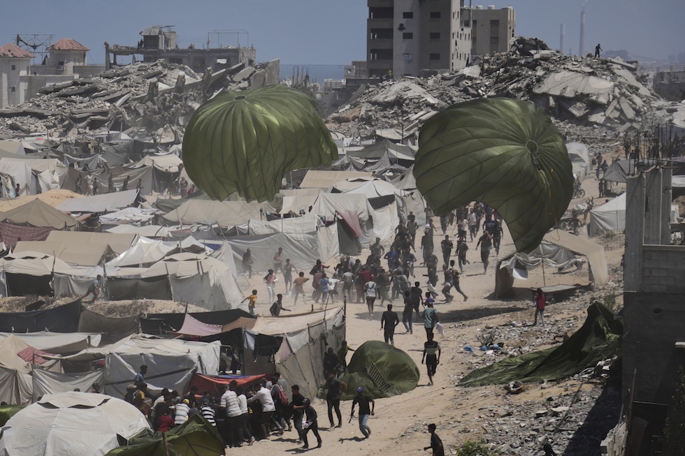 Aiuti umanitari paracadutati nella città di Gaza, il 7 agosto del 2025 (AP Photo/Jehad Alshrafi)