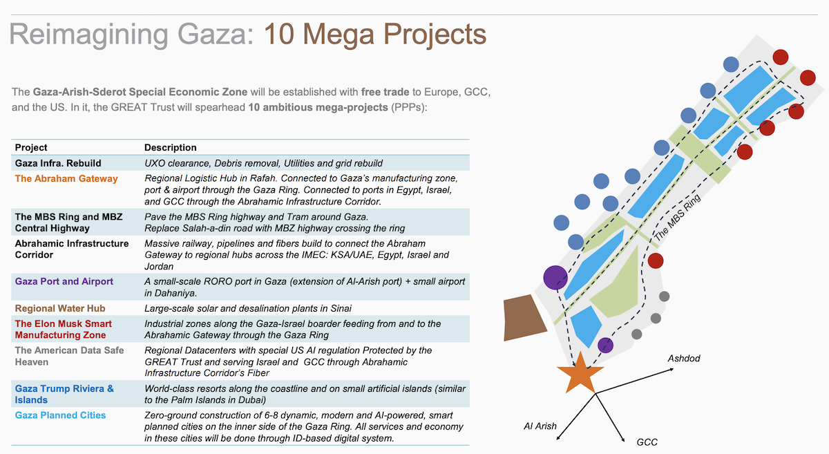 Fra i punti principali del progetto c’è l’idea di trasformare la zona costiera della Striscia in un’enorme area per turisti, con resort e spiagge. L’interno invece ospiterebbe «fra le 6 e le 8 città dinamiche, moderne, ripensate con l’intelligenza artificiale», piene di grattacieli. Nel nord troverebbe spazio un distretto industriale intitolato a Elon Musk, e una strada circolare nominata come il leader autoritario dell’Arabia Saudita, Mohammed bin Salman.