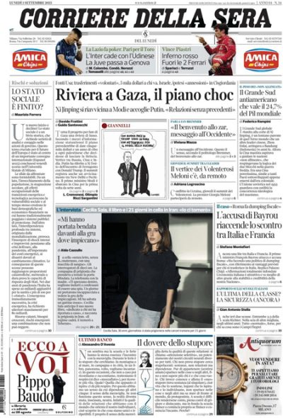 Le notizie principali in apertura sui giornali di oggi sono le anticipazioni pubblicate dal Washington Post sul piano del presidente degli Stati Uniti Trump per la ricostruzione della Striscia di Gaza, che prevederebbe il controllo degli Stati Uniti sulla zona per dieci anni e 5mila dollari per chi lascia volontariamente la Striscia, e l’incontro a Tientsin, in Cina, dell’Organizzazione per la cooperazione di Shanghai, con la partecipazione fra gli altri dei capi di stato e di governo di Cina, India e Russia. Qualche giornale comincia poi ad affrontare i possibili contenuti della prossima legge di bilancio, Libero titola sulla partenza delle barche della Global Sumud Flotilla per portare aiuti alimentari a Gaza, e Domani si occupa dei rapporti fra la Lega e la Russia. I giornali sportivi commentano i risultati di ieri del campionato di Serie A maschile di calcio e le ultime trattative del calciomercato, che finisce stasera.