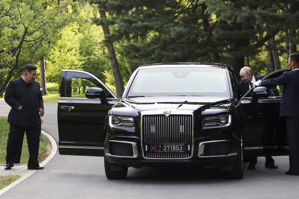 Kim Jong Un e Vladimir Putin in giro con la Aurus Senat a Pyongyang nel giugno del 2024 (Gavriil Grigorov, Sputnik, Kremlin Pool Photo via AP)