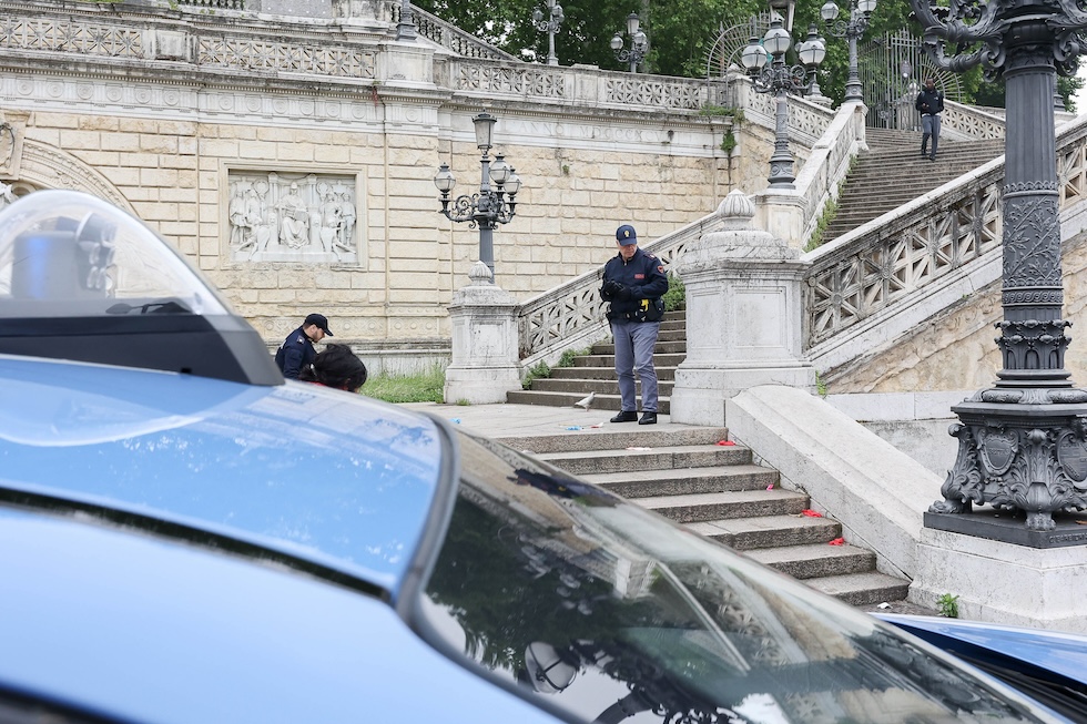 La polizia fa i rilievi sulla scalinata del Pincio, tra piazza XX Settembre e il parco della Montagnola, dopo l’omicidio di un 21enne il 16 maggio 2024: anche quest’area è tra le “zone rosse” di Bologna (Guido Calamosca/LaPresse)