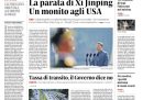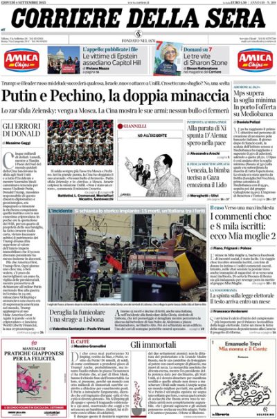 Quasi tutti i giornali di oggi titolano in apertura sulla parata militare organizzata a Pechino, in Cina, per commemorare l’ottantesimo anniversario della fine della Seconda guerra mondiale, a cui hanno assistito fra gli altri il presidente russo Vladimir Putin e il leader nordcoreano Kim Jong Un. Le altre notizie principali sulle prime pagine sono l’incidente alla funicolare della Glória a Lisbona, il successo della proposta di acquisto di Mediobanca da parte di MPS, l’attacco israeliano in Libano nella zona in cui stavano lavorando alcuni membri della missione UNIFIL della Nazioni Unite, e il viaggio delle barche della Global Sumud Flotilla verso la Striscia di Gaza.
