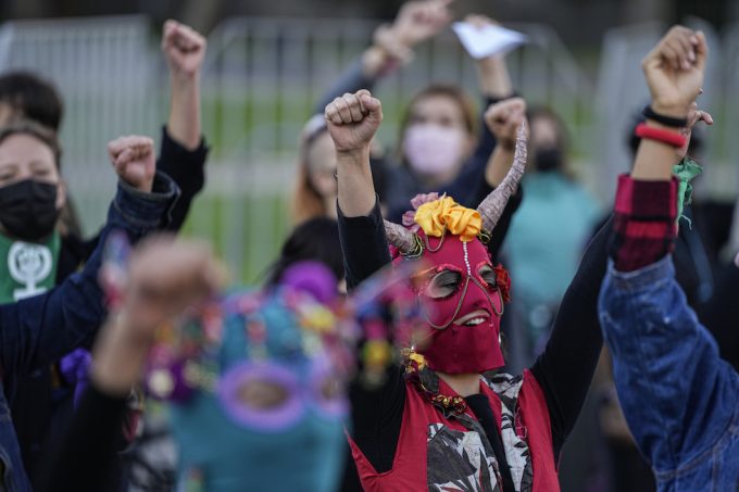 Manifestazione femminista a Santiago, in Cile, 7 marzo 2022 (AP Photo/Esteban Felix)